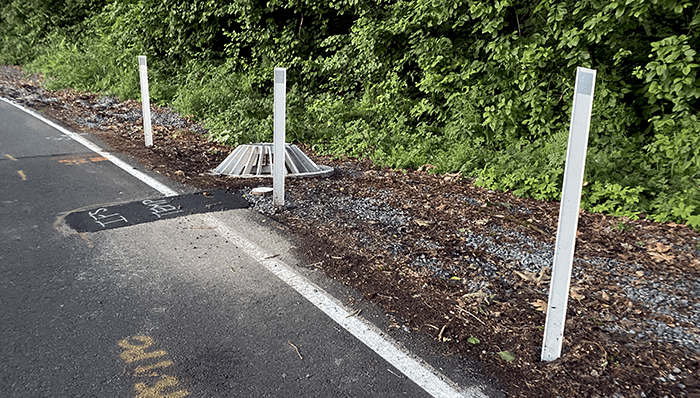 But they added three reflective stakes in front of it. We don’t think these will stop a car, though.
