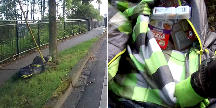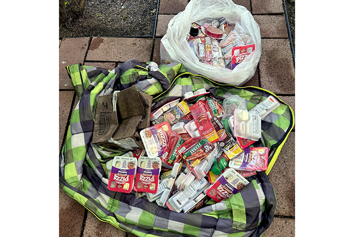 There were Lunchables, snacks, several packages of turkey hotdogs, bottles of milk, etc. Most of it required refrigeration, so the whole lot is spoiled and headed for the garbage bin. We’ll send the sleeping bag to Goodwill.