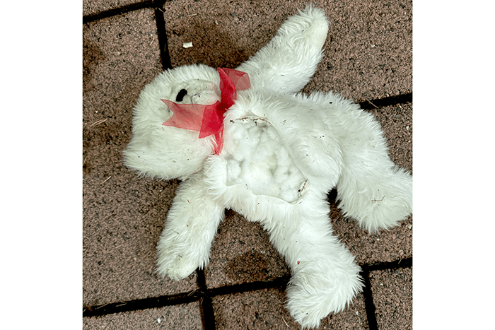 There is often a guy playing a guitar here looking for handouts, but he keeps the area clean. This looked more like someone just tossed a bunch of stuff. There was a half-full, large water bottle, and a couple more unopened bottles. Also some unopened yogurts and a nearly full box of GoGo SqueeZ Fruit-on-the-Go packets. We emptied the water bottles and got rid of all but the GoGo SqueeZ packets which we sent to a local food bank. Also, there was an inflated and tied rubber glove. We have no idea what that was for.