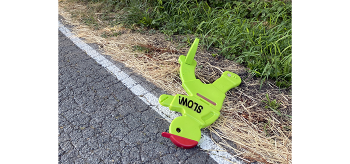 It was well run over, bent, and the case was split open. Surprisingly, when we plugged it into power, the screen partially lit up and seemed operational, though we couldn’t read the screen. There’s no way to get it back to the owner, if they even want it back.