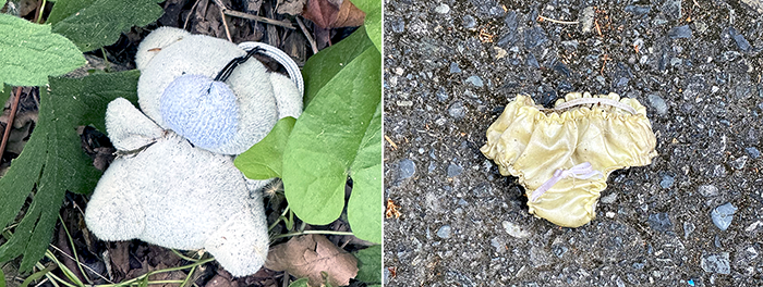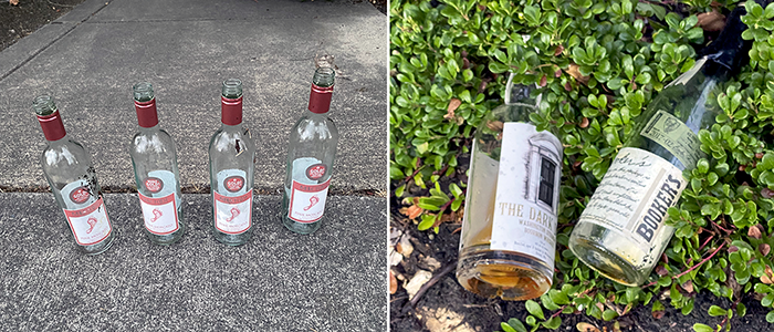 Four bare feet. Four bottles of Barefoot Pink Moscato, about $6.50 a bottle. This last Saturday, we found two more of these in the same area. Across the street at the entrance to Jackson’s, we found two bourbon bottles, Booker’s and Wildwood, The Dark Door Bourbon. Both priced at about $100 apiece. This is obviously the rich side of the street. The Wildwood still had about an eighth of it left that we dumped out, so like ten dollars’ worth.