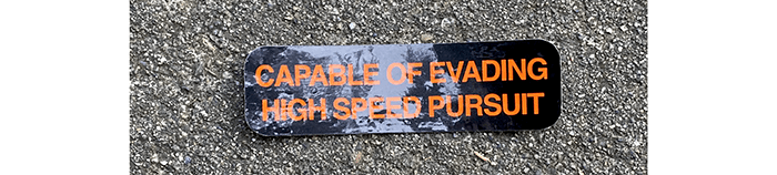 It’s a motorcycle helmet sticker. We don’t think that is a good thing to advertise. He was going so fast it blew off his helmet.