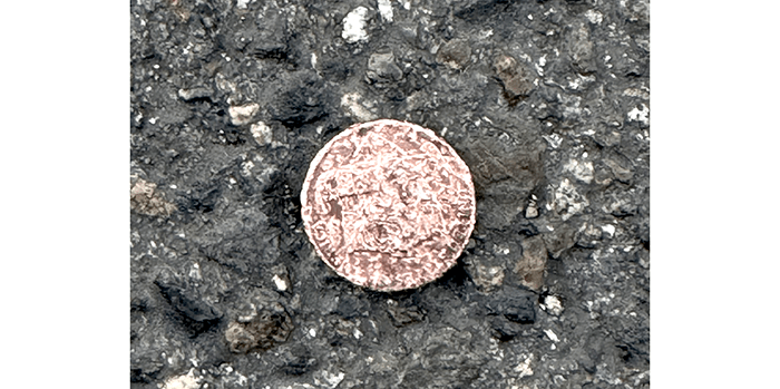 A penny in the park-and-ride, a quarter in a crosswalk, and another penny in a parking lot. Twenty-seven cents.