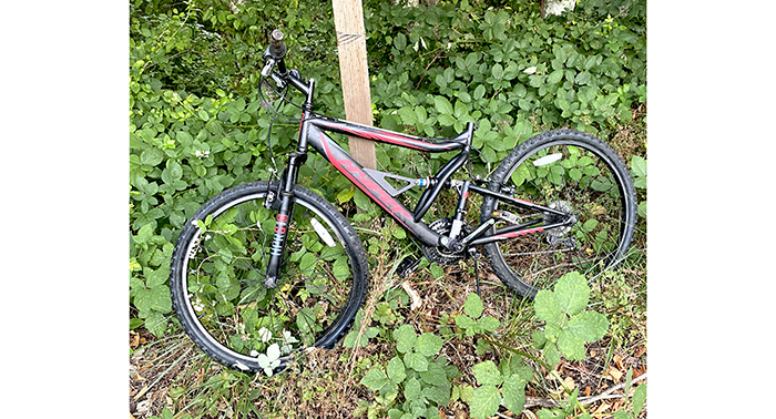 Most of the bikes we find have been stolen and abandoned. However, this one has a missing seat, and the front wheel is very warped. So, this fell off a vehicle and got run over. We found it on the Walmart site for $148. We pulled it out of the bushes and leaned it against a post in case the owner comes looking for it.