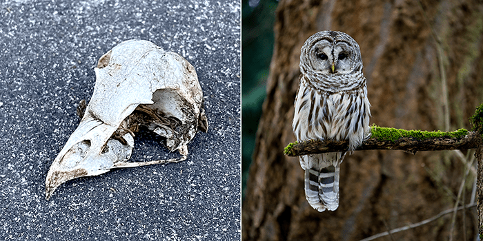 According to this site, it is the skull of a Barred Owl. Barred Owls are common around here. The photo above is one we took near our home a few years back. We’ve removed two dead owls during our walks, but we don’t remember where, so this skull may have been one of them.