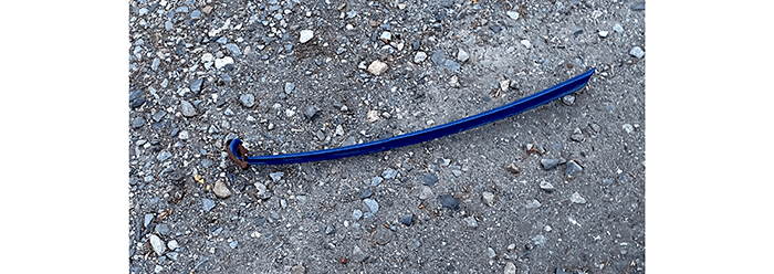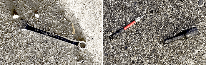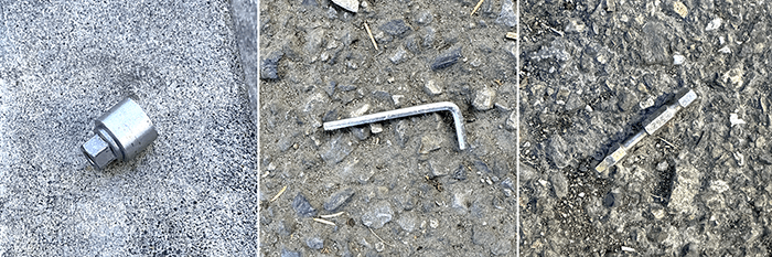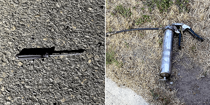 We found a screwdriver on the northbound freeway on-ramp and a greasy grease gun on the southbound on-ramp. It must have slid off the truck.
