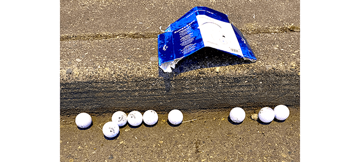 After we took the photo, we found another in the weeds for a total of ten. On Amazon, a package of twelve is twenty-five dollars, so this is twenty-one dollars’ worth in excellent condition. We will look for the missing two, but don’t hold your breath. There are several drains in the area so the person who dropped the balls may have achieved two holes-in-one.