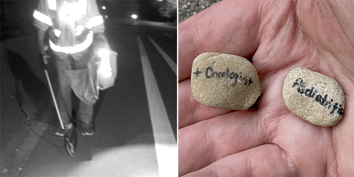 Among the glass shards, we picked up two small rocks with writing. One had “Oncologist” on it and the other, “Pediatritian [sic]”. We are sure the jar and the stones are connected. When aspiring doctors finish their pre-med education, they gather and pull these stones out of the jar to determine their future specialty. Obviously two candidates dropped out. That is our story, and we are sticking with it.