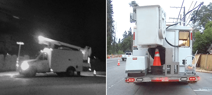 Later, as we reached the intersection of 100th Ave NE and Simonds Road, we saw the same truck. It had the TV cable snaked down through a window in the back of the truck, and we heard some TV audio. We assume that he is splicing or otherwise working on the fiber cable. But he was very antisocial, or he is just watching soap operas.