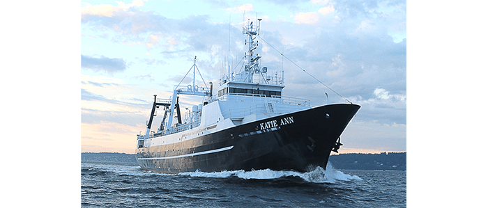 Katie Ann, Pride of the Sea. With a little Googling we found that it is a Factory Fishing Trawler out of Seattle.