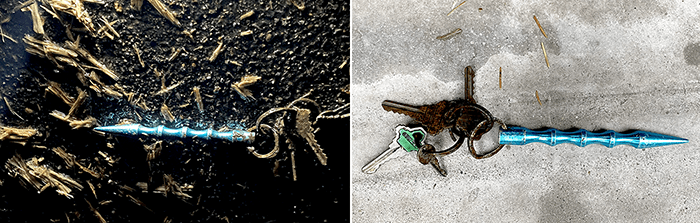 When we examined it closer, it was not a pen, but Kubotan Self Defense Keychain. It looks painful. The keys had been there a while and there is no identification, so they will go into our key jar.