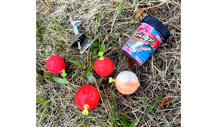 Trout bait, four floats and a fishing line bell. With this equipment, the fish were under the water laughing at him. We can’t blame them, he didn’t have any hooks and the fish were taking the bait. They would have liked to hear the bell ring, though.