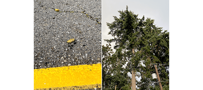 This seems to happen to us every year. We are walking down the street, minding our own business when we start getting pelted with pinecones by a squirrel.