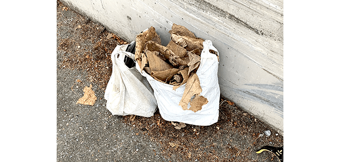 But wait, there’s more. At the intersection, a lot of cardboard was run over, and we gathered it up and stuffed that into the garbage bag.
