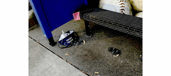 At the bus stop near Safeway, we found someone had left a pair of socks and a small bag with trash in it even though there is a trash receptacle about eight feet away. The bag is from Madison House, a local memory care facility. That explains it.