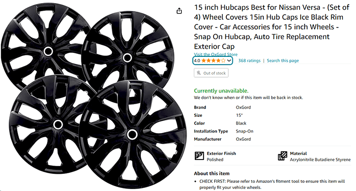 “Currently unavailable.” So, are they flying off the shelf faster than they can be restocked? And does that imply Nissan has a wheel cover problem? We recycled the wheel cover, but perhaps we should have kept it for a potential class action case.