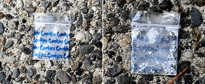 It’s a dime bag and it has some residue in it. In the old cop movies the detective would put his finger in and taste it. It could contain Fentanyl. Cops don’t do that anymore if they ever did. And no, we didn’t either, we tossed it in the garbage. And yes, we know it could be harmful to a garbage dump rat, but, like humans, it has a choice.