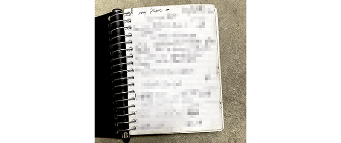 Near Safeway, this notebook and pen were in the gutter, dropped by someone leaving Safeway. We took a quick look at the first page and the first entry was an entry labelled “My Phone” with a number.