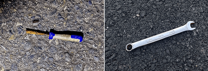 A very small, rusty and broken screwdriver, and a very nice 9mm combination wrench. The screwdriver counts, but it was in bad condition and got recycled. The wrench went into our ever-increasing Found/Lost Tool Collection.