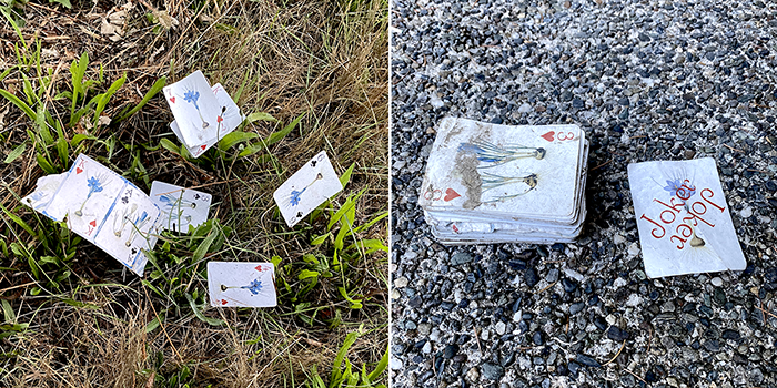 On 100th Ave NE and Simonds Road, we both started finding playing cards, including part of the cardboard wrapper.
