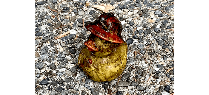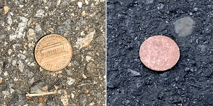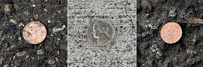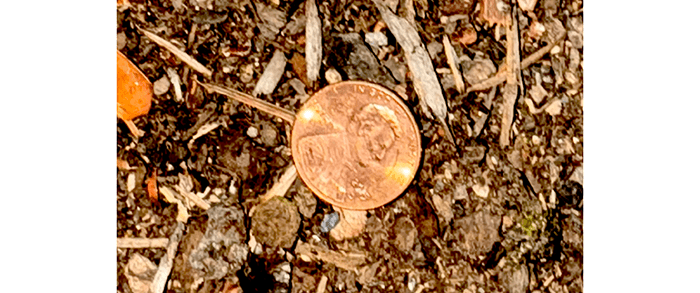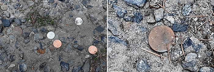 Two dimes and two pennies, nice. However, on the left, look at the object half buried under the set of black rocks. We pulled it out and saw it was a badly tarnished nickel that had been there a while. We need a metal detector. Anyway, our total money finds came to sixty-two cents, which totally eclipsed last week’s total take. On the negative side, we removed a roadkill crow.
