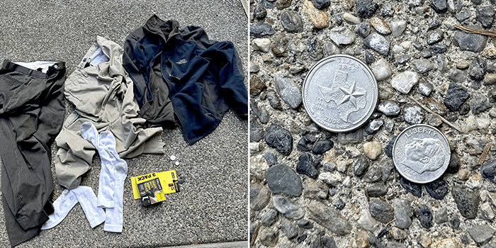 Anyway, we noticed some change had fallen out of the pants pockets, thirty five cents, more than we made all last week. But wait, there’s more.