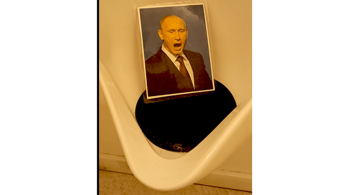 It was unlocked with no keys. This happens when someone opens their trailer and hangs the open lock on the hasp. After their work is done, they close the doors and proceed to the new job assuming the lock will stay in place. A bad assumption. Like Hitler assuming attacking Russia would be a piece of cake. Or like Putin invading Ukraine. A piece of cake. A friend went to Vancouver B.C. this weekend and sent us this photo of the urinal in a men’s restroom.