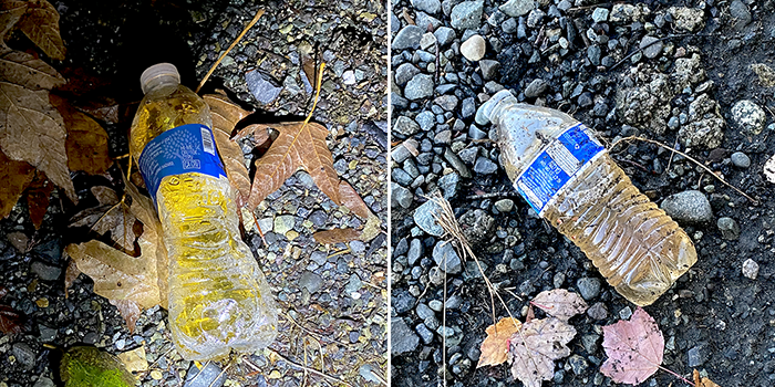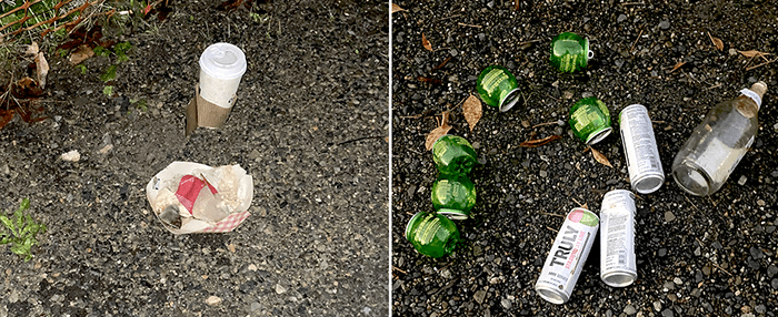 We are collecting at least five times as much debris since before the construction began including food wrappers, cigarette butts, and lots of empty and half empty water bottles. Fortunately, the construction area is relatively free of alcohol containers. Past the construction is a different story. We keep pulling cans and bottles out of the bushes. At one point, we pulled out six Buzzballz, three Truly Hard Selzer cans and a large Modelo bottle.