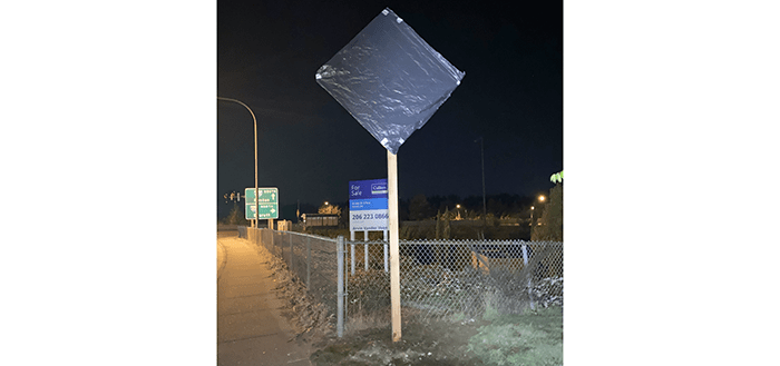 Under the plastic, we could see that it appeared to be orange, so it’s a construction sign of some sort. There is a lot of construction going on, and there are a lot of temporary signs that get set up and taken down during the construction phases. But this one is serious. It’s semi-permanent and about ten feet tall. When it is unveiled, we think it will read something like “Warning! Major Disruption Ahead. Expect to be late for everything.” But we’ll see.