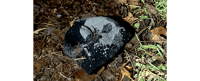 It seems to have a skull or a storm trooper image on it. It was probably tossed by a disgruntled trick-or-treater. “Oh, how cute! A storm trooper.” “No, it’s a death skull cap, you idiot!”