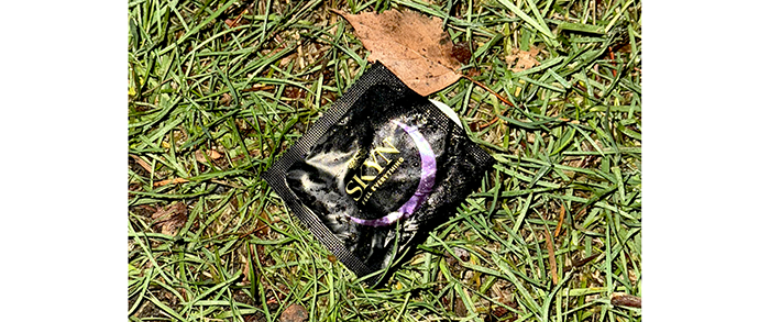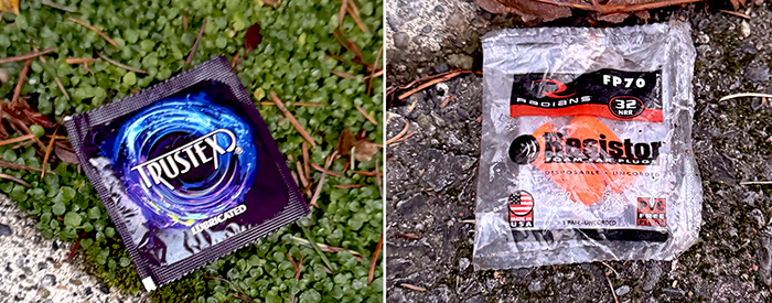 An unopened condom and an unopened pair if ear plugs. There are so many stories that come to mind here.