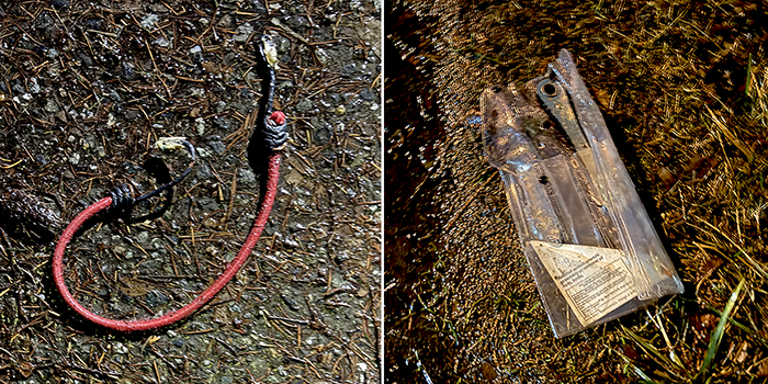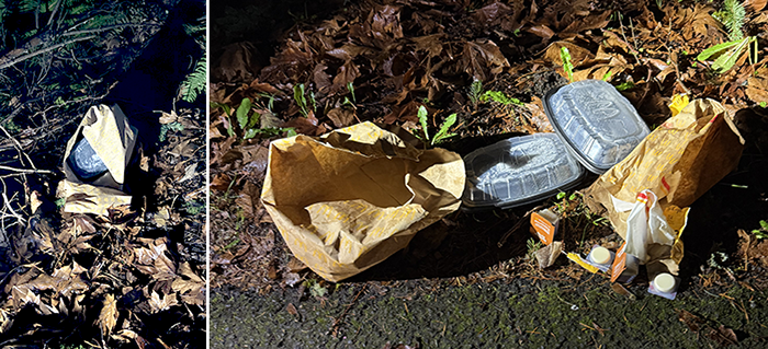 We have found well over fifty of these people’s McDonalds litter. They always have two cups with teabags, two clean platters, a bag of unused utensils, two unopened syrups and four or five unopened butters. The first image is down a steep bank that Chuck traversed.