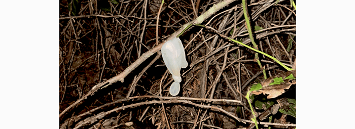 A used condom hanging on a bush. The bag contained mostly trash.