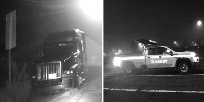 On the North-bound freeway on-ramp, we spotted a tractor-trailer rig parked on the apron. As we approached and started to head back, a Washington State Department of Transportation (WSDOT) Incidence Response truck slowed.