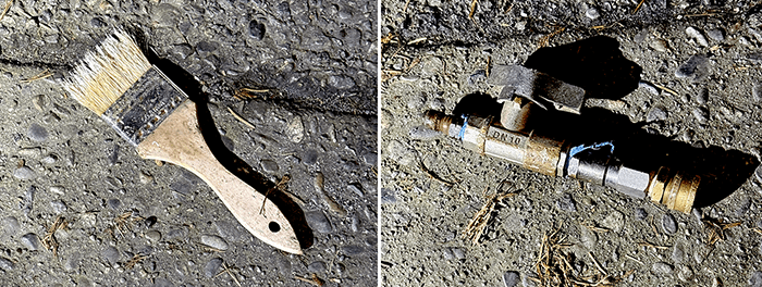 A used paint brush but still in usable condition, and a quick-connect valve assembly. It consists of a male quick connect, a ball valve, a swivel joint and a female quick connect. This could be used for something like a pressure washer. We are guessing the parts alone are between fifty or seventy dollars’ worth. The ball valve alone is about forty dollars. Not counting the value of the paint brush.