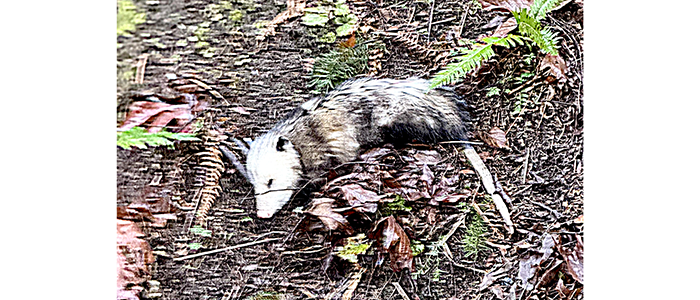 Today was another comfortable day and much of our route has already been covered in our last three walking days, so the amount of trash was less. Not light, but lighter. Again, we came across no money and no roadkill. We did find an almost roadkill. Near the end of our walk, we spotted an opossum up on a bank.