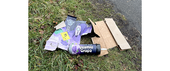 Since the big freeze, we have covered about half of this morning’s route on previous walks, so we figured it would be an easy one. We figured wrong. The construction area was clean, but Simonds Road and NE 145th St. were messy. We picked up two more of the large NO2 Canisters, another watermelon and a grape flavor. We decided to leave them and a car part at a corner for pick up later with the car.