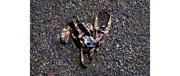 A camouflaged winch strap. We almost missed it. Unfortunately, vehicles ran over it and it was destroyed. But the strap is fine, if you could see it.