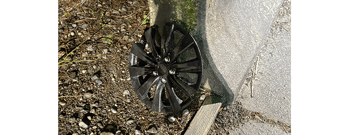 Someone set up a wheel cover against a barrier in hopes the owner would find it.