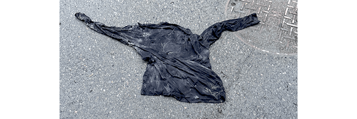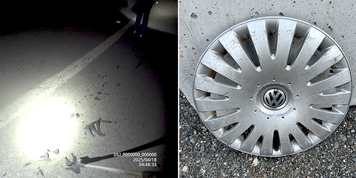 The first thing was an unidentifiable wheel cover that spent too much time in the fast lane. It took us a few minutes to pick up the big pieces. The second, a VW fared better, but still damaged. Both got recycled.