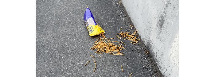 Someone tossed a nearly full bag of pretzels on the freeway overpass.