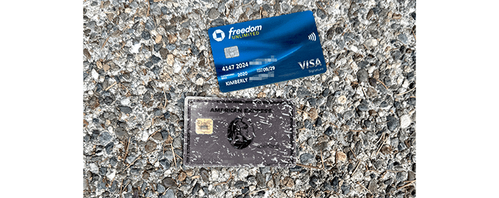 We picked up two of Kimberly’s credit cards about twenty feet apart.