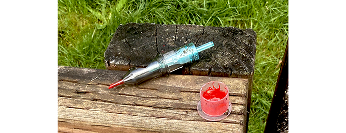With the help of Google, we found this is a tattoo needle with some red ink. Obviously, a pop-up tattoo parlor. She got a tattoo that says, “I make impulsive decisions and I’m not afraid of tetanus.”