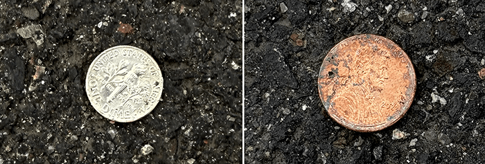 A dime and a penny close to each other in a parking lot. Spokane is a treasure trove.