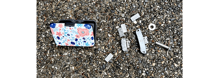 A screw, a washer, and several tire weights. There is a tire store close to where we walked, so the lost tire weights are not a good recommendation for them. They must have some unbalanced customers. The item on the left is a cheap plastic case for credit cards, six bucks on Amazon. It holds up to ten credit cards. With that much credit, one should be able to get a better wallet.