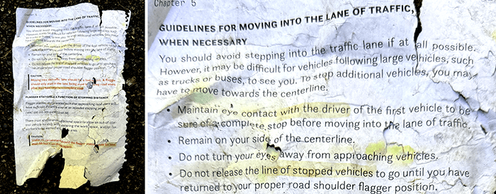 Ironically, at the time of impact, the flagger was reading the line: ‘Do not turn your eyes away from approaching vehicles.’
