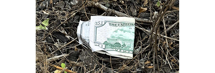 We walked to the end of the fence and came back fighting a couple of trees to get by, but it was worth it. In the ten years we have been walking, this is only the second fifty-dollar bill we have found. It made our week, and probably our year. We did find more change through the week.