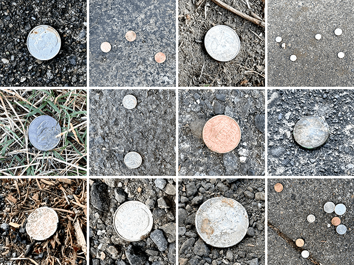 In the upper right, we found five dimes and a nickel on the overpass, but one of the dimes was bent in half. At the bus stop on Brickyard Road, we long ago hung up a plastic bag for folks to use for trash. And in the lower right, we found seventy-eight cents in the bag. This is the second time we’ve found money in it.
