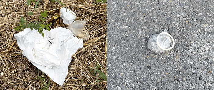 As we approached, picking up bits of trash, a lady got out of one car, said she would pick up the trash by her car, which she did, and put it in my bag. She then proceeded to get into the first car. That was nice of her, but it would have been better if she had picked up the condom too.