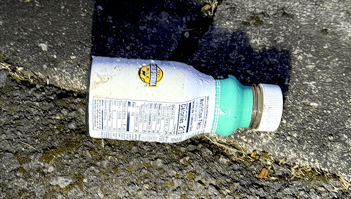 This looked like a typical dairy drink, and we opened it to dump it out. However, the contents didn’t look like milk, and one sniff identified it a well-aged urine. Got milk?